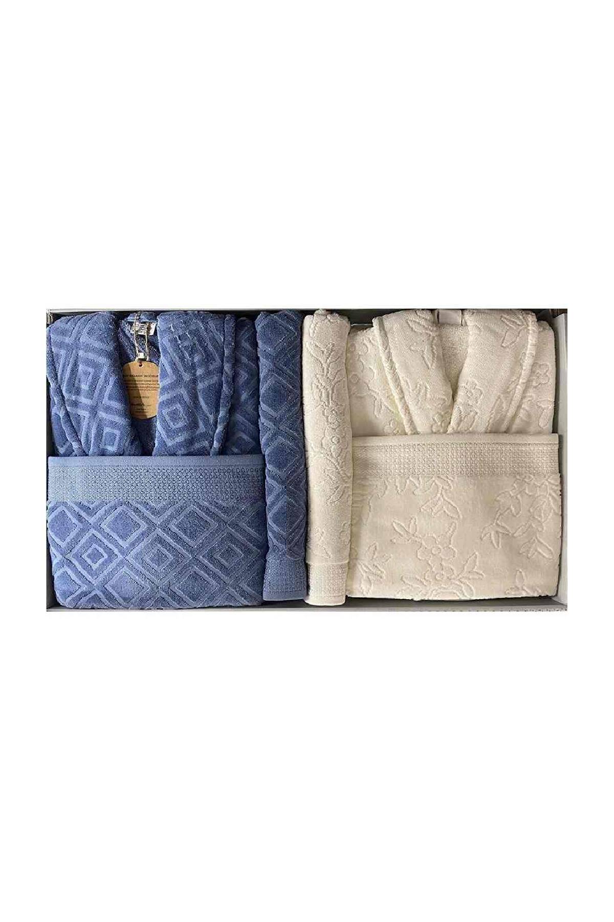 Özdilek Pastoral Krem Lacivert Aile Bornoz Seti