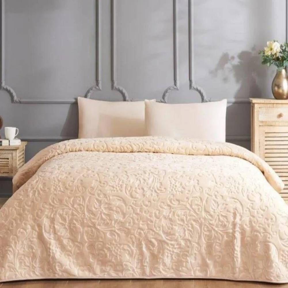 • Zarif Kabartma (Embos) Desenler: Battaniye yüzeyindeki kendinden desenli floral kabartmalar, yatak odası dekorasyonuna derinlik ve sofistike bir hava katar.
