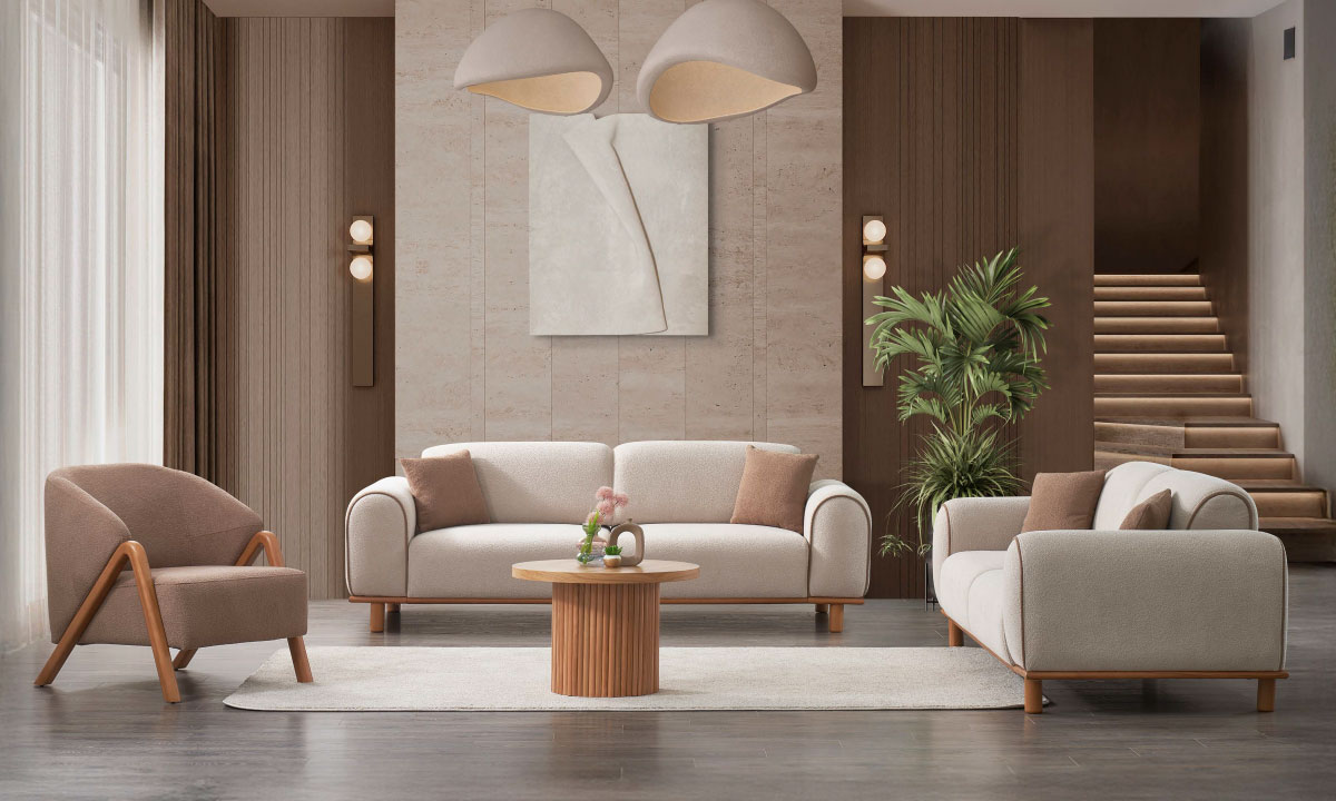 Renk Kombinasyonu Krem/Bej Ana Sofa ve Kontrast Berjer