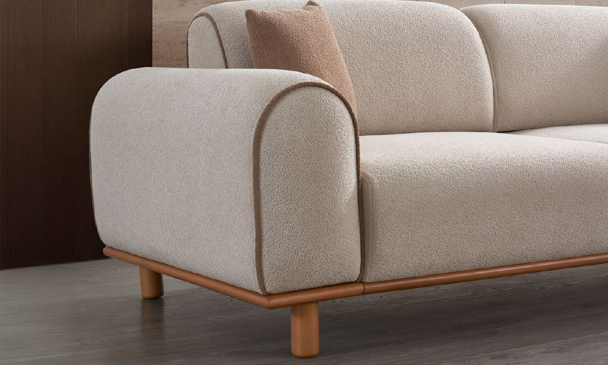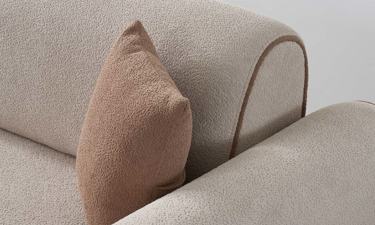 Pamir Koltuk Takımı 3+3+1 – Yuvarlak Hatlı Boucle Kumaş, Kontrast Biye Detaylı, Yüksek Ayaklı, Yataklı