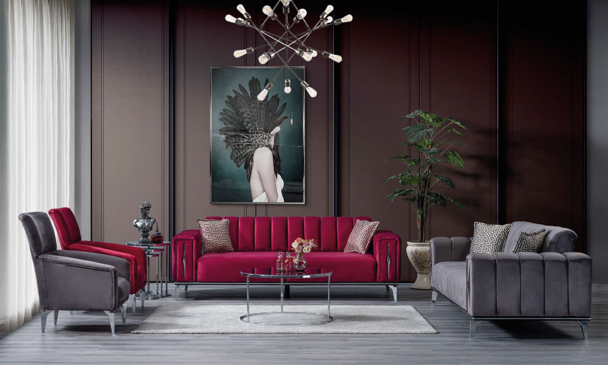 • Set İçeriği: 1 Adet Mürdüm/Vişne 3’lü Kanepe + 1 Adet Gri 3’lü Kanepe + 1 Adet Berjer