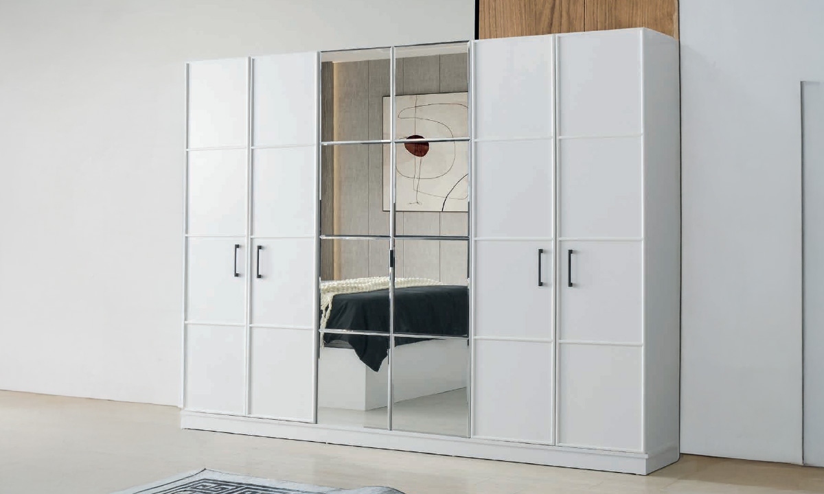 Fonksiyonel Gardırop: 6 kapılı geniş yapısı ve ortadaki aynalı kapakları sayesinde kıyafetleriniz için maksimum depolama alanı sunarken odayı daha geniş gösterir.