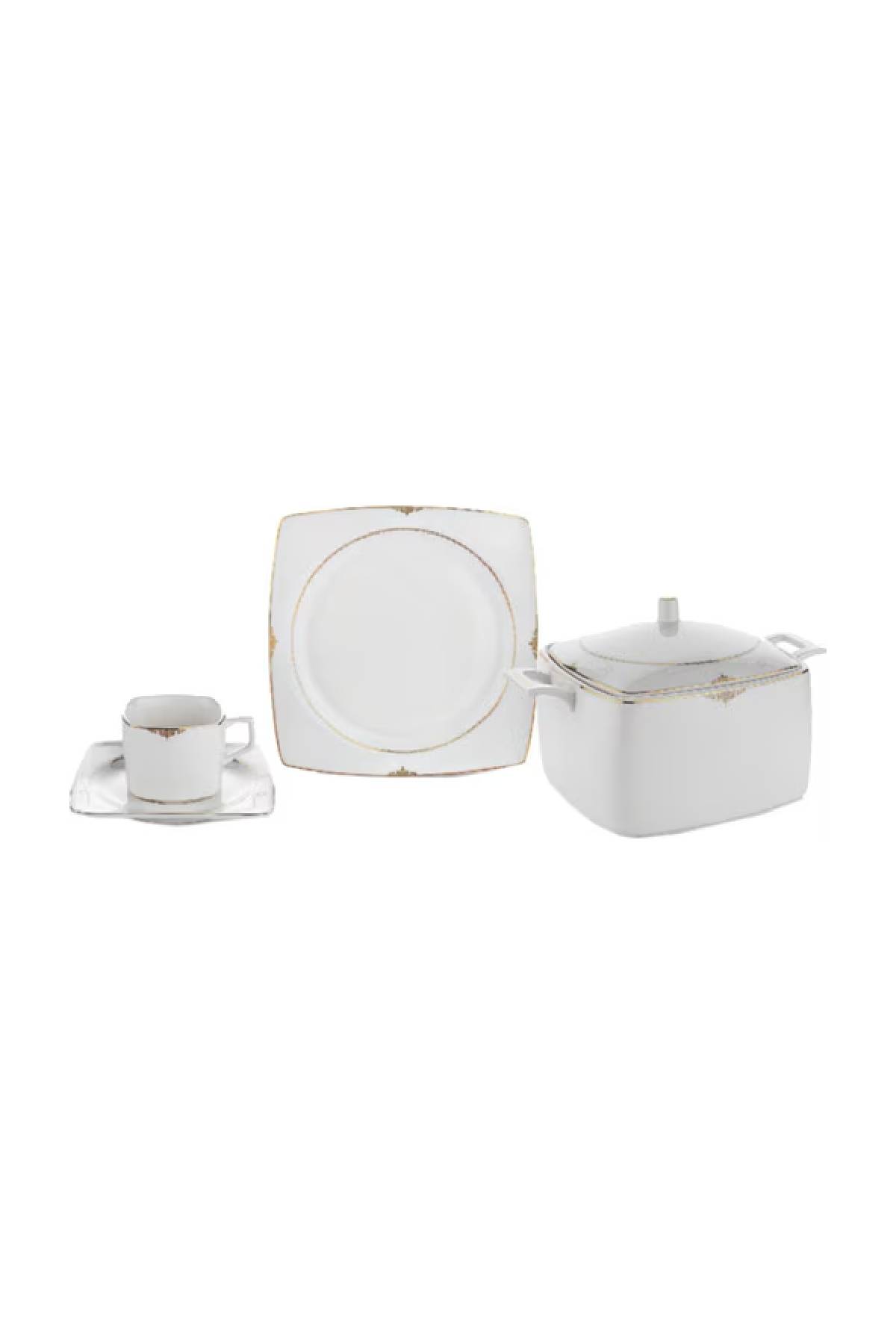 Schafer Platz 60 Parça Yemek Takımı – 12 Kişilik, Kare Tasarım, Altın Yaldızlı Lüks Bone Porselen Çeyiz Seti (Altın 01)
