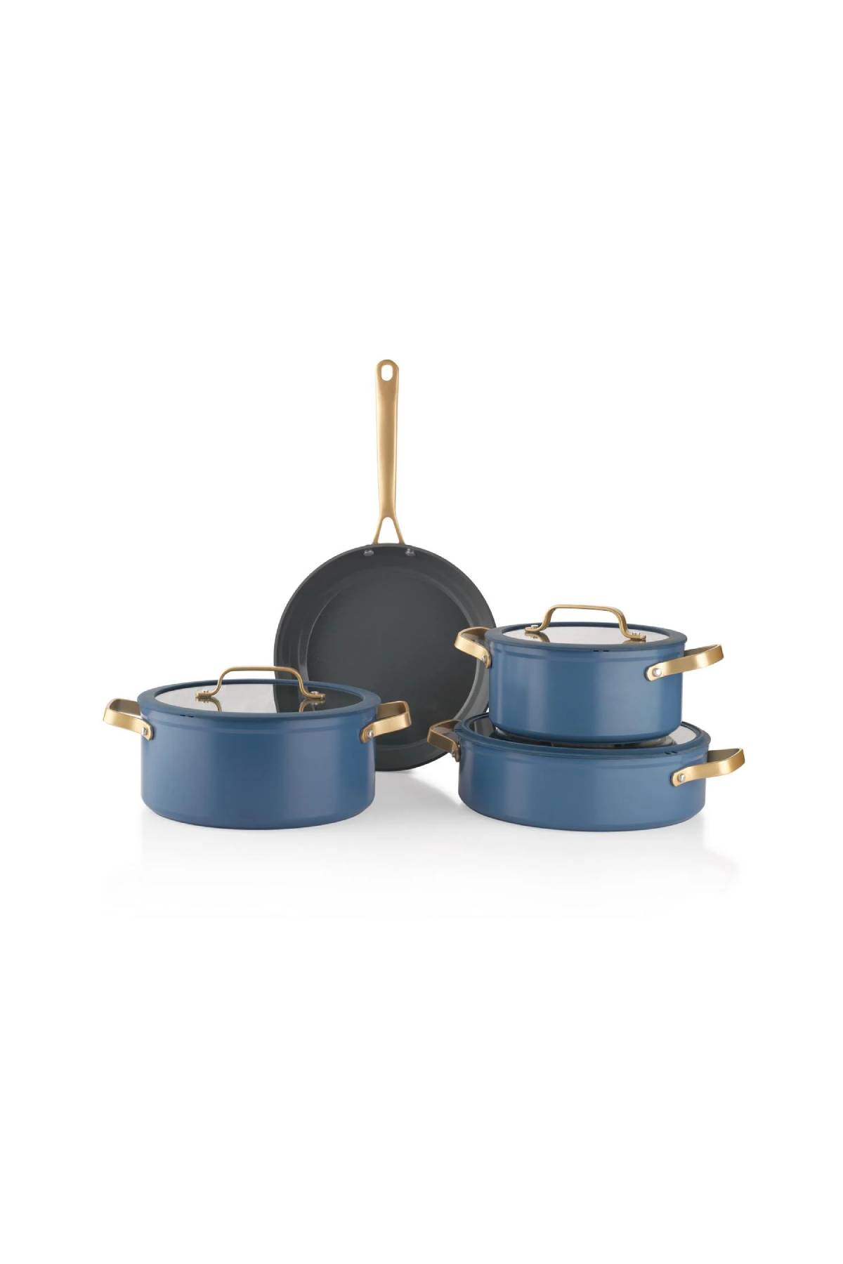 Schafer Sapphire Seramik Tencere Seti 7 Parça – Mavi, Gold Kulplu, İndüksiyon Uyumlu
