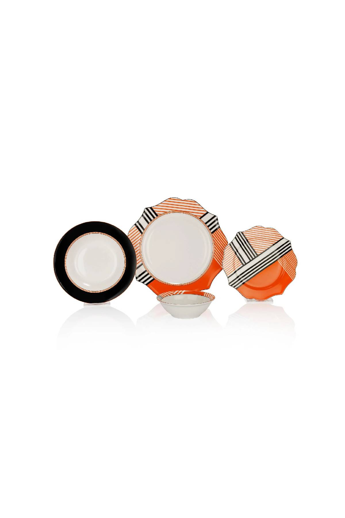• Modern Geometrik Tasarım: Turuncu renk geçişleri ve siyah-beyaz çizgili motifler, sofranıza yenilikçi ve iddialı bir stil katar.
