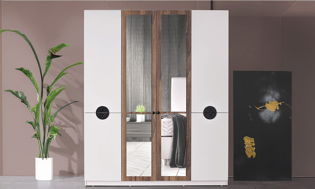• Aynalı ve Ahşap Detaylı Tasarım: Orta kısımdaki iki kapakta bulunan boy aynaları, odanın daha büyük görünmesini sağlarken, çevresindeki sıcak ceviz/ahşap tonu, beyaz gövdeye modern ve sıcak bir kontrast ekler.