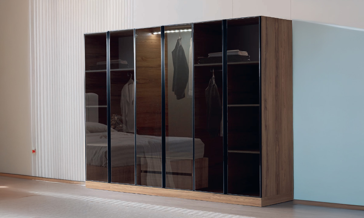 Şeffaf Bir Lüks: Zen Serisi Sıradan dolapların kapalılığını reddeden Zen 6 Kapılı Dolap, yatak odanızı özel bir giyinme odasına (dressing room) dönüştürüyor. 6 kapağın tamamında kullanılan füme (koyu) reflekte camlar, odanıza derinlik katarken, içerisindeki eşyaları loş ve gizemli bir şıklıkla sergiler.