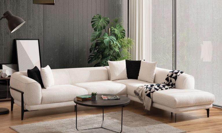 Orfa Modern Modüler Köşe Takımı – Metal İskeletli Ekru Buklet Kumaş L Koltuk